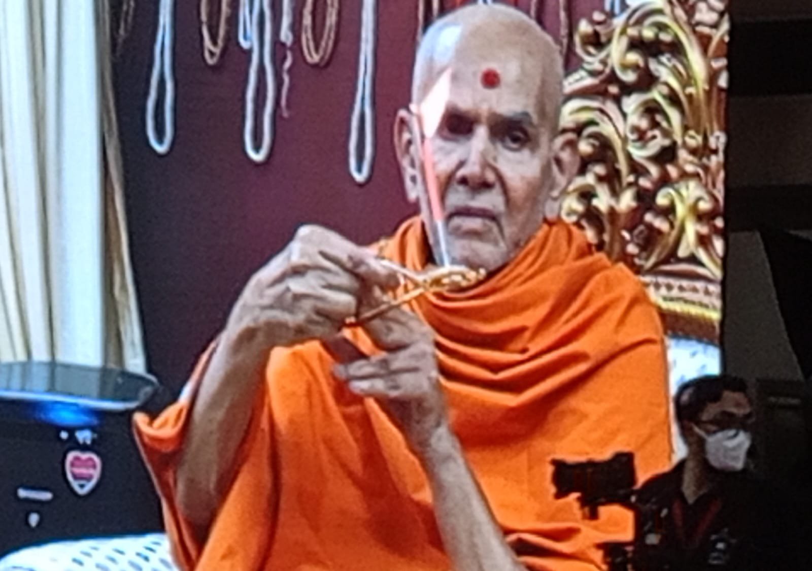 मंत्रोचार के मध्य महंत स्वामी नारायण के आगमन तथा मंच पर आसन ग्रहण करने के बाद, उपस्थित दर्जनों संतों व हरि भक्तों द्वारा उनकी आरती-