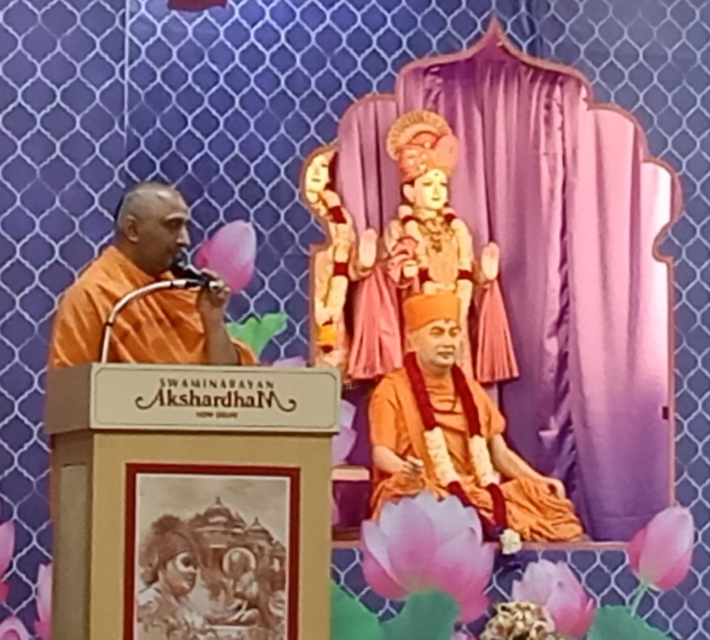इत्यादि इत्यादि सु-मधुर गाए जा रहे भजनों तथा अक्षर धाम मंदिर के पूज्य संतो में प्रमुख ईश्वर चरण स्वामी इत्यादि इत्यादि द्वारा दिए गए प्रवचनों में कहा गया, सर्वोत्तम भगवान स्वामी नारायण हैं, उनका आश्रय सबसे बड़ा है। उनका आश्रय ग्रहण करने के बाद भक्त निर्भय हो जाते हैं। कहा गया, शरणागति वह है जो भगवान नहीं चाहते हैं, उनका पालन करना। मंदिर स्वामी जी द्वारा आश्रय भिक्षा मंत्र पाठ कर उसके महत्व के बावत अवगत कराया गया।