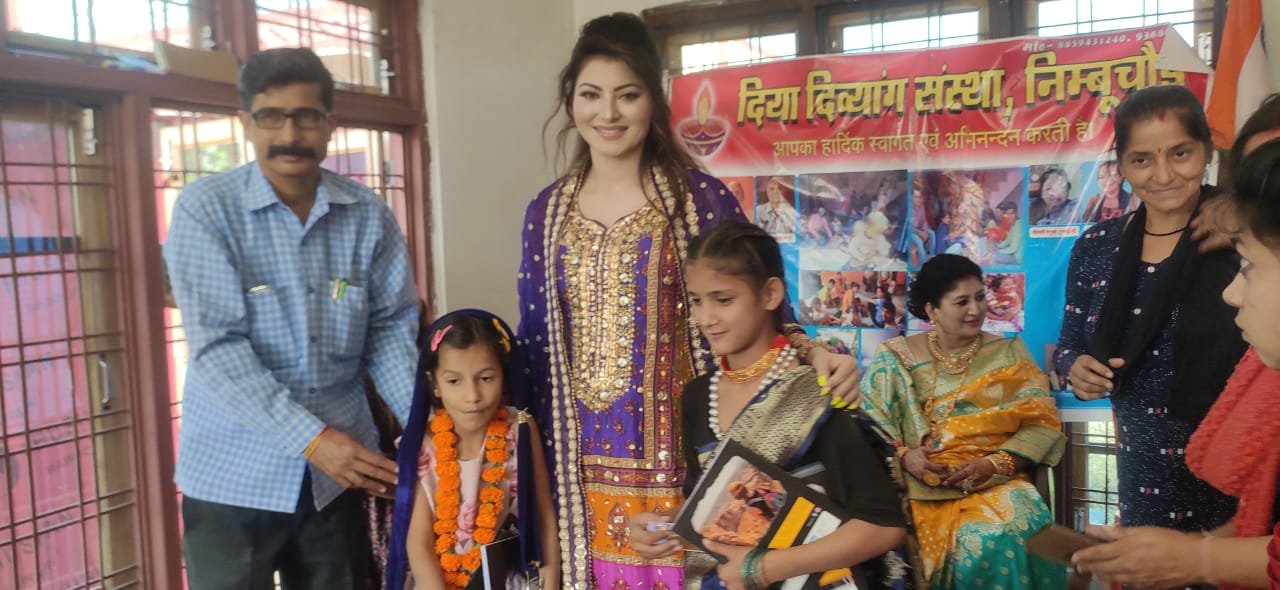 कोटद्वार।आज कोटद्वार के *दिया दिव्यांग सँस्था ,निम्बूचौड़* में बॉलीवुड अभिनेत्री व मिस इंडिया यूनीवर्स उर्वशी रौतेला व उनके सचिव चन्द्रमोहन जदली ने दिव्यांग बच्चों को अनेक उपहार,फ़ल, मिठाई,आईसक्रीम,जलेबी, कॉपियाँ,पेन,पेंसिल,रबर,ज्योमैट्री बॉक्स,किताबें इत्यादि सामग्री वितरित की। इस अवसर पर उर्वशी रौतेला की माँजी मीरा रौतेला, मनवर सिंह रौतेला भी उपस्थित थे। उर्वशी रौतेला ने दिव्यांग बच्चों के साथ जमकर नृत्य भी किया।