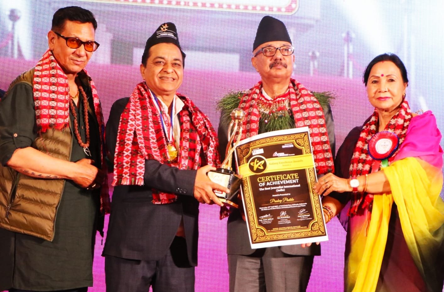 आयोजित अंतर्राष्ट्रीय आयोजन के इस अवसर पर पत्रकारिता, संस्कृति और सामाजिक प्रचारक के क्षेत्र मे विगत पन्द्रह वर्षों से भी अधिक समय से निरंतर प्रभावशाली कार्य कर रहे भारत (उत्तराखंड) के प्रदीप फुटेला को सर्वश्रेष्ठ अंतर्राष्ट्रीय पत्रकारिता पुरस्कार से तथा भारत (छत्तीसगढ़) की रूना शर्मा व सोनम श्रीवास्तव को अंतर्राष्ट्रीय फलक पर सर्वश्रेष्ठ संस्कृति और सामाजिक प्रचारक के लिए गैलेक्सी एक्सीलेंस अवार्ड 2023-2024 से मुख्य अतिथि के कर कमलो नवाजा गया।