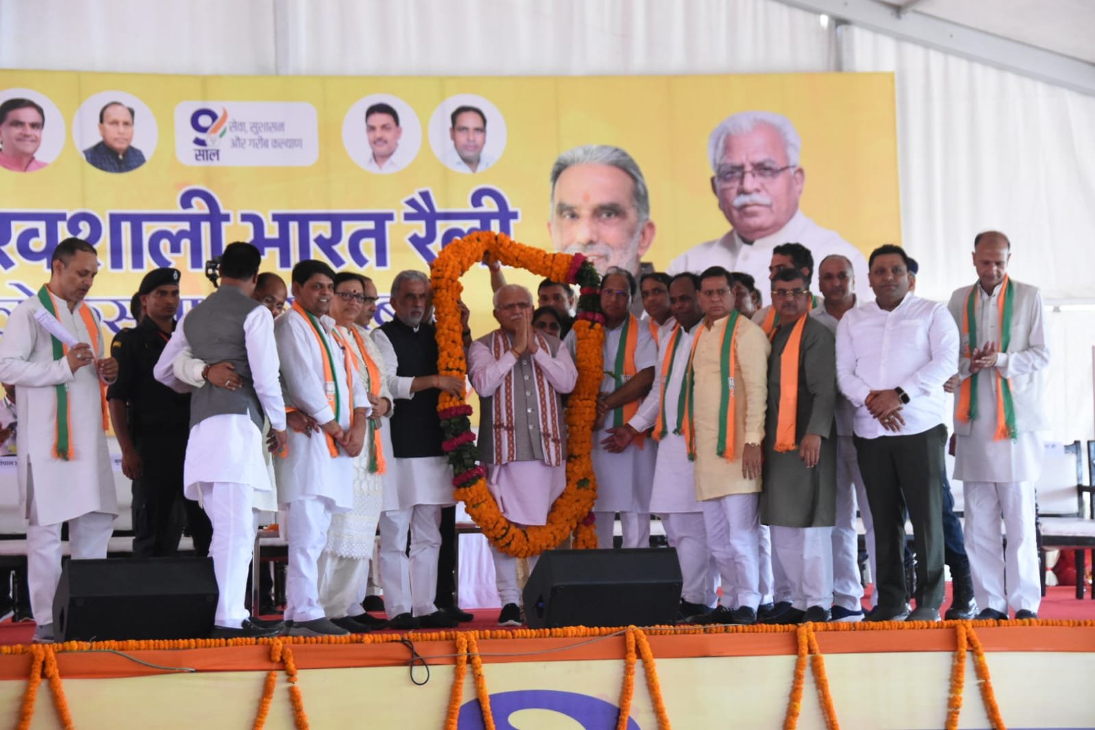 मुख्यमंत्री रविवार को पलवल जिला के गांव गदपुरी में फरीदाबाद लोकसभा क्षेत्र की गौरवशाली भारत रैली को सम्बोधित कर रहे थे। रैली में पहुंचने पर रैली के संयोजक एवं केंद्रीय राज्यमंत्री कृष्णपाल गुर्जर ने मुख्यमंत्री सहित अन्य अतिथिगणों का अभिनंदन किया।