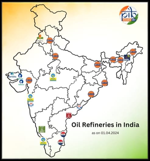 वर्तमान में, भारत में तेल परिशोधन के लिए उन्नीस सार्वजनिक क्षेत्र उपक्रम (पीएसयू) रिफाइनरी, तीन निजी क्षेत्र की रिफाइनरी और एक संयुक्त उद्यम रिफाइनरी हैं। देश की रिफाइनिंग क्षमता अप्रैल, 2014 में 215.066 मिलियन मीट्रिक टन प्रति वर्ष (एमएमटीपीए) से बढ़कर अप्रैल, 2024 में 256.816 एमएमटीपीए हो गई है