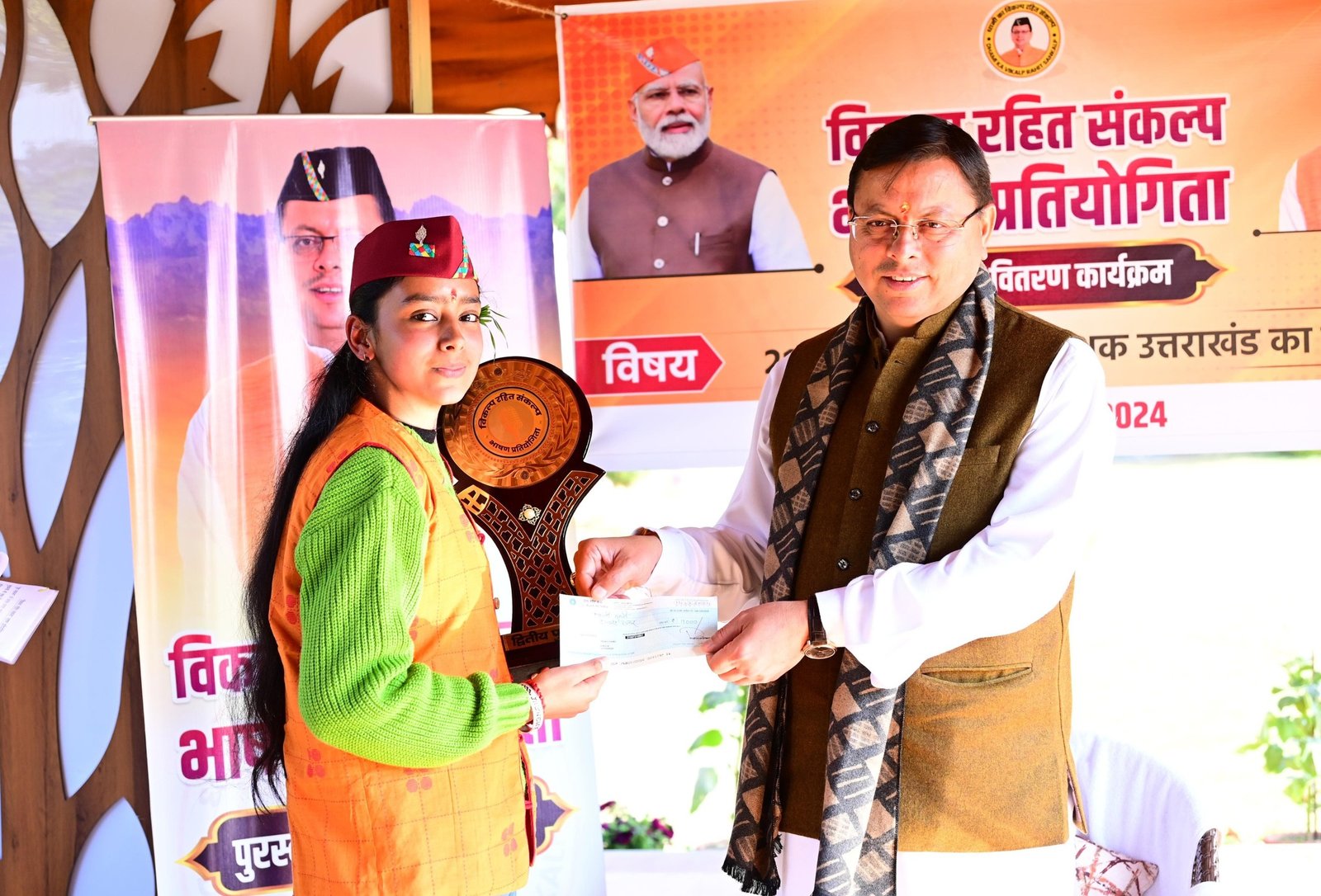 बुधवार को मुख्यमंत्री श्री पुष्कर सिंह धामी ने मुख्यमंत्री आवास में आयोजित कार्यक्रम में प्रथम दुर्गेश अमोली, द्वितीय शाम्भवी मुरारी, तृतीय विनय कुमार, चतुर्थ आयुषी पांडे, तथा पंचम प्रज्ञा पंत को ट्रॉफी एवं पुरस्कार देकर सम्मानित किया।