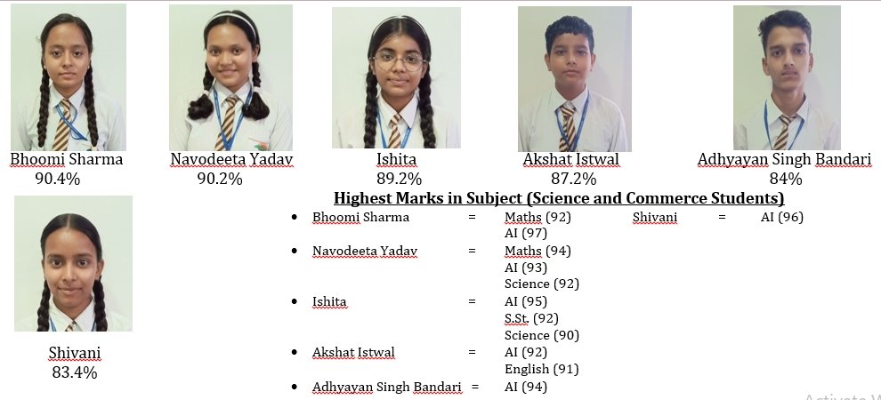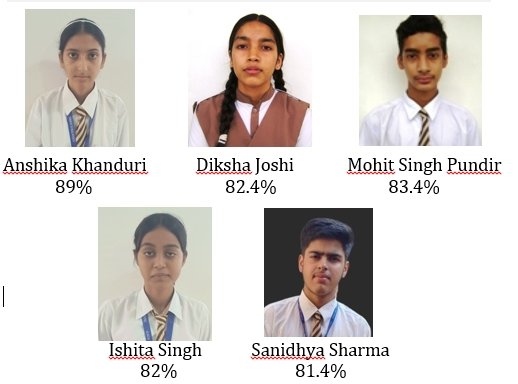 वहीं 10वीं की कक्षा का भी परीक्षा परिणाम शत प्रतिशत रहा जिसमें भूमि शर्मा ने 90 प्रतिशत अंक प्राप्त कर विद्यालय में प्रथम स्थान प्राप्त किया। नवेदिता यादव 90 प्रतिशत, ईशिता 89 प्रतिशत, अक्षत इस्तवाल 87 प्रतिशत, अध्ययन सिंह भंडारी 84 प्रतिशत और शिवानी ने 83 प्रतिशत अंक प्राप्त किय।