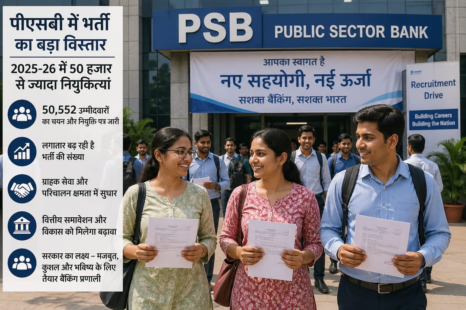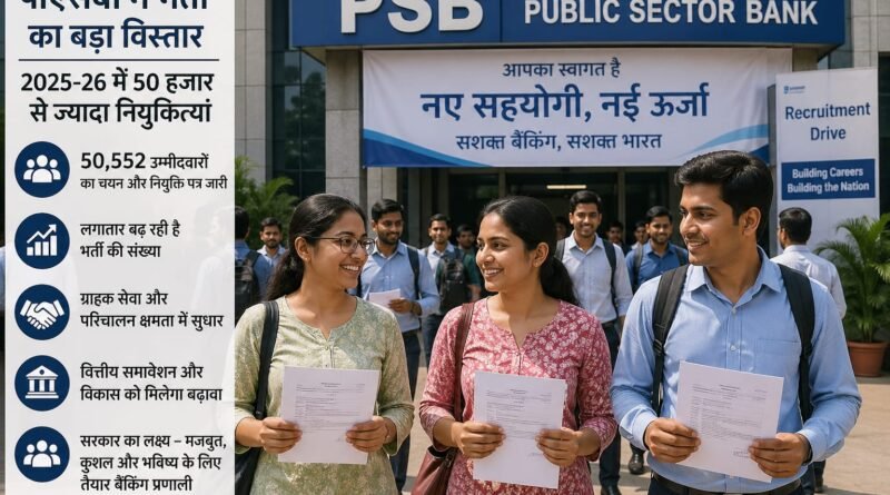 आंकड़ों के मुताबिक, वित्त वर्ष 2025-26 में कुल 50,552 उम्मीदवारों का चयन कर उन्हें नियुक्ति पत्र जारी किए गए हैं। इससे पहले वित्त वर्ष 2023-24 में यह संख्या 30,827 थी, जो 2024-25 में बढ़कर 37,860 हो गई थी। लगातार बढ़ती भर्ती संख्या यह दर्शाती है कि सरकार बैंकिंग क्षेत्र की बढ़ती आवश्यकताओं को पूरा करने के लिए ठोस रणनीति पर काम कर रही है।