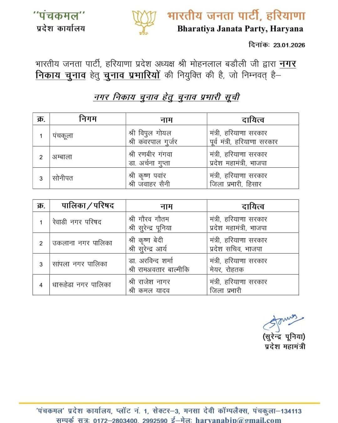 जारी पत्र के अनुसार भाजपा प्रदेश अध्यक्ष पंडित मोहन लाल बड़ौली ने पंचकूला नगर निगम चुनाव के लिए कैबिनेट मंत्री विपुल गोयल और पूर्व मंत्री कंवर पाल गुर्जर को चुनाव प्रभारी नियुक्त किया है। इसी तरह अंबाला नगर निगम चुनाव के लिए मंत्री रणबीर गंगवा और प्रदेश महामंत्री डा. अर्चना गुप्ता को प्रभारी नियुक्त किया है।