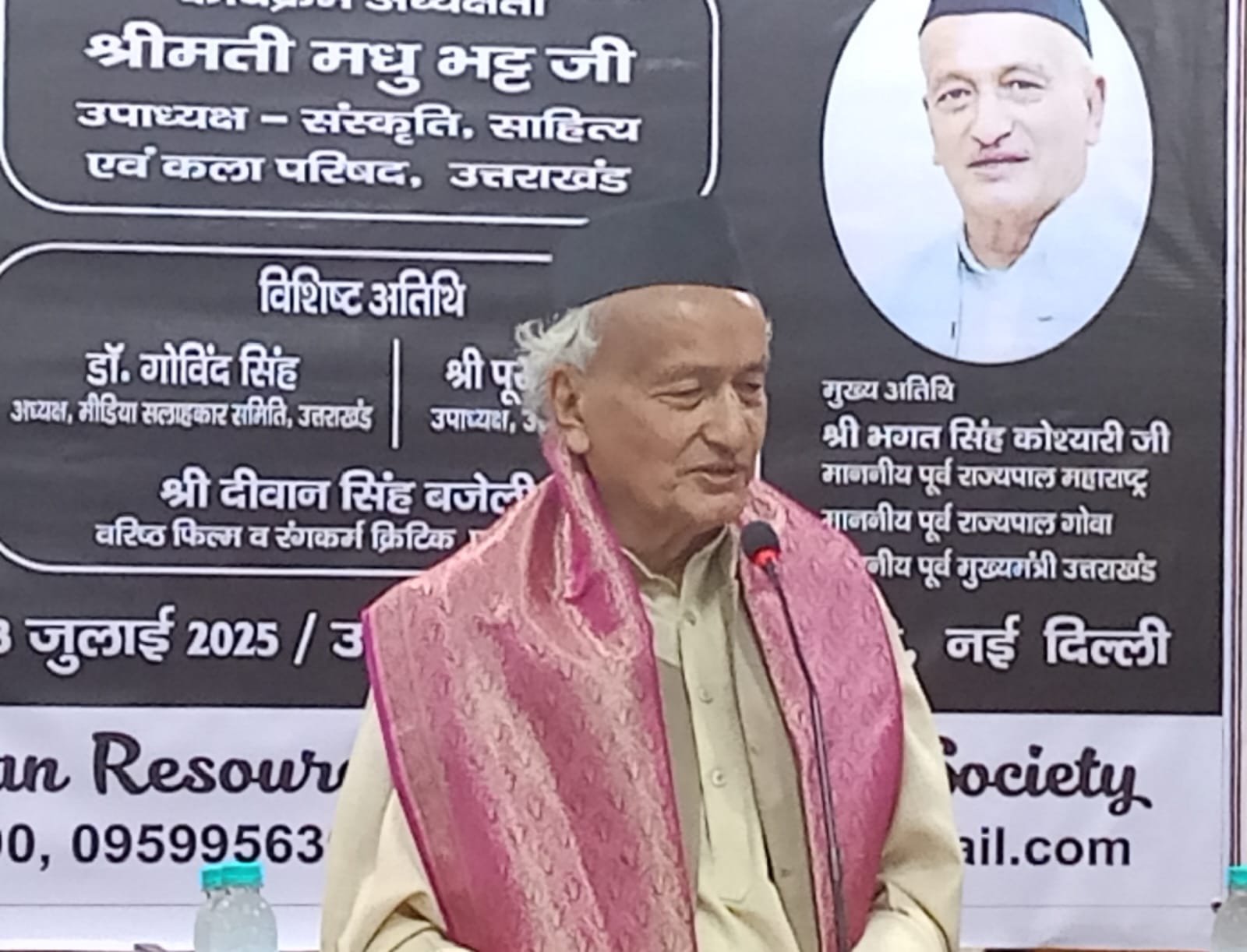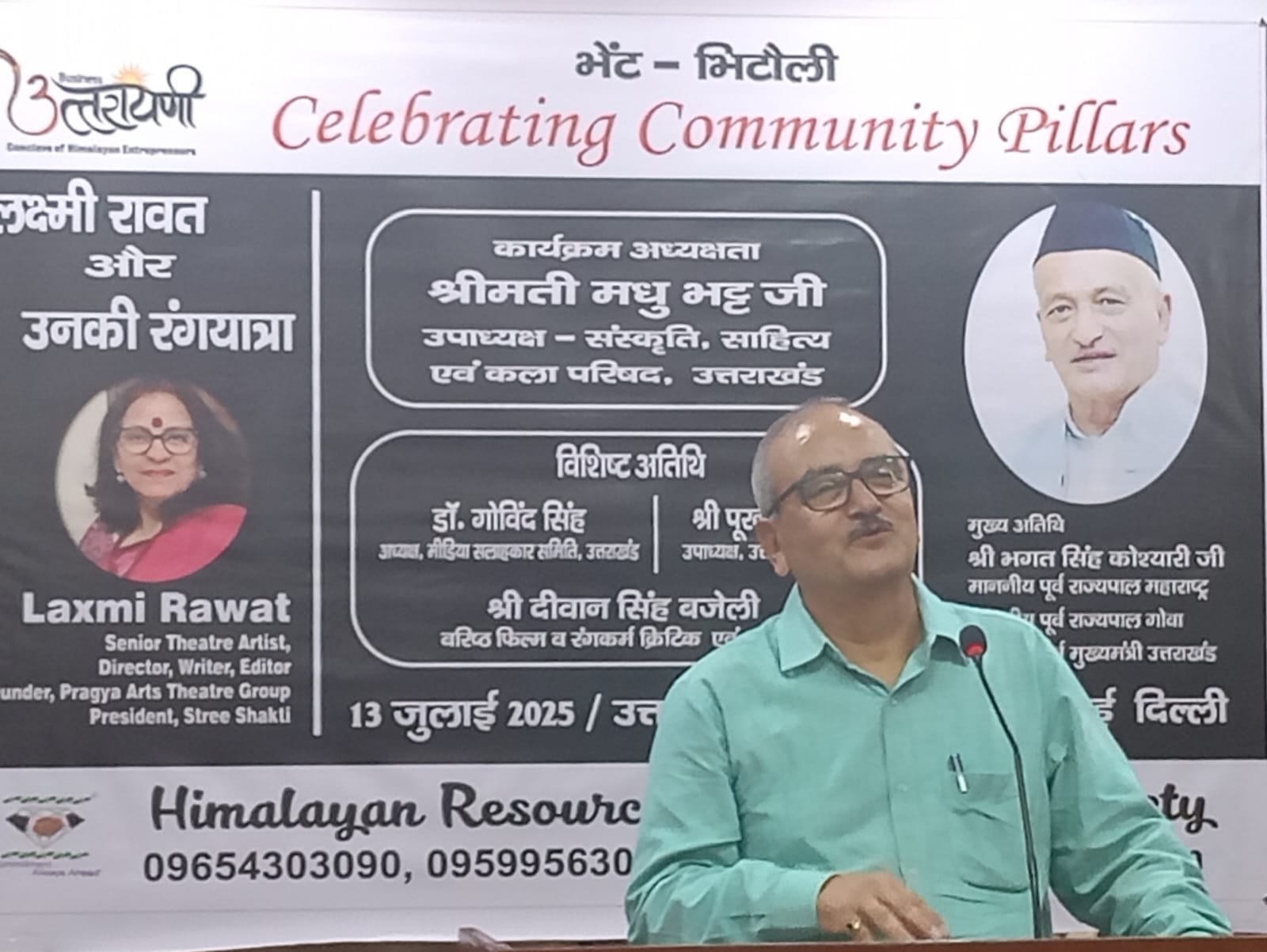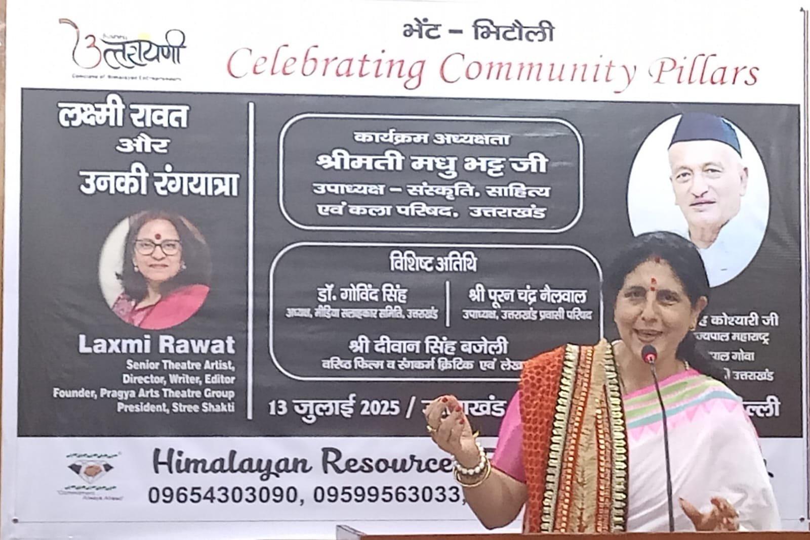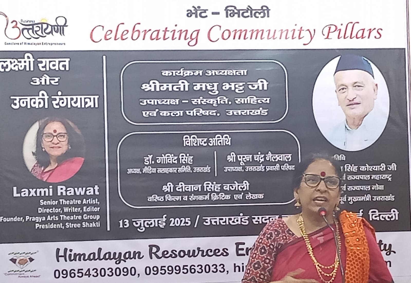 नई दिल्ली। 12 जुलाई को उत्तराखंड सदन चाणक्यपुरी में भेंट-भिटौली कार्यक्रम के तहत उत्तराखंड की सुप्रसिद्ध रंगकर्मी लक्ष्मी रावत और उनकी विगत तैतीस वर्षों की रंगयात्रा पर एक प्रभावशाली चर्चा का आयोजन मुख्य अतिथि उत्तराखंड के पूर्व मुख्यमंत्री व महाराष्ट्र तथा गोवा के राज्यपाल रहे भाजपा वरिष्ठ नेता भगत सिंह कोश्यारी की प्रभावी उपस्थित तथा मुख्यमंत्री उत्तराखंड मीडिया सलाहकार समिति अध्यक्ष डॉ. गोविंद सिंह की अध्यक्षता तथा उत्तराखंड सरकार संस्कृति, साहित्य एवं कला परिषद उपाध्यक्ष मधु भट्ट व संगीत नाटक अकादमी सम्मान प्राप्त दिवान सिंह बजेली मंचासीनों की उपस्थित में आयोजित किया गया।