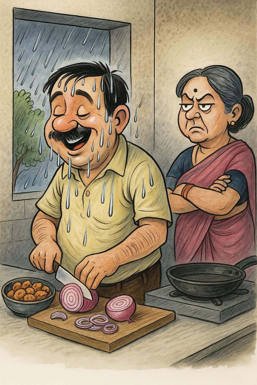 बस फिर क्या था! आधा बचा हुआ उत्साह भी ठंडा पड़ गया। लेकिन पहली बारिश को *सेलिब्रेट* तो करना ही था। तो मैंने थोड़ा अनुनय-विनय की मुद्रा में श्रीमती जी की तरफ देखा। श्रीमती जी मेरा इशारा समझ गईं। बोलीं – “नहीं, मैं नहीं बनाऊँगी पकोड़े! तुम्हें तो परवाह नहीं, शुगर, कोलेस्ट्रॉल सब बढ़े हुए हैं। डॉक्टर ने मना किया हुआ है, लेकिन फिर भी पकोड़े याद आ रहे हैं!”