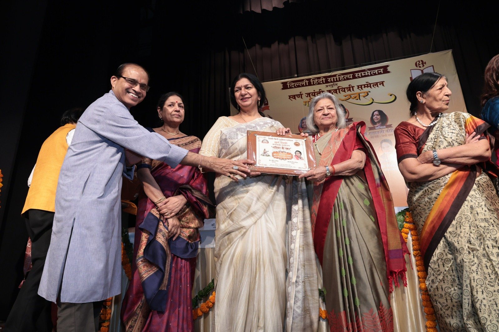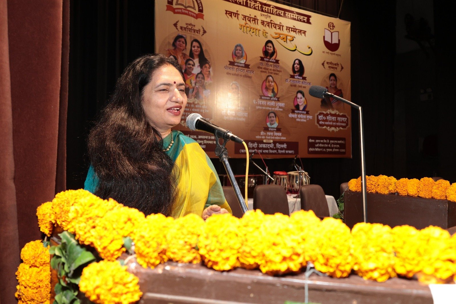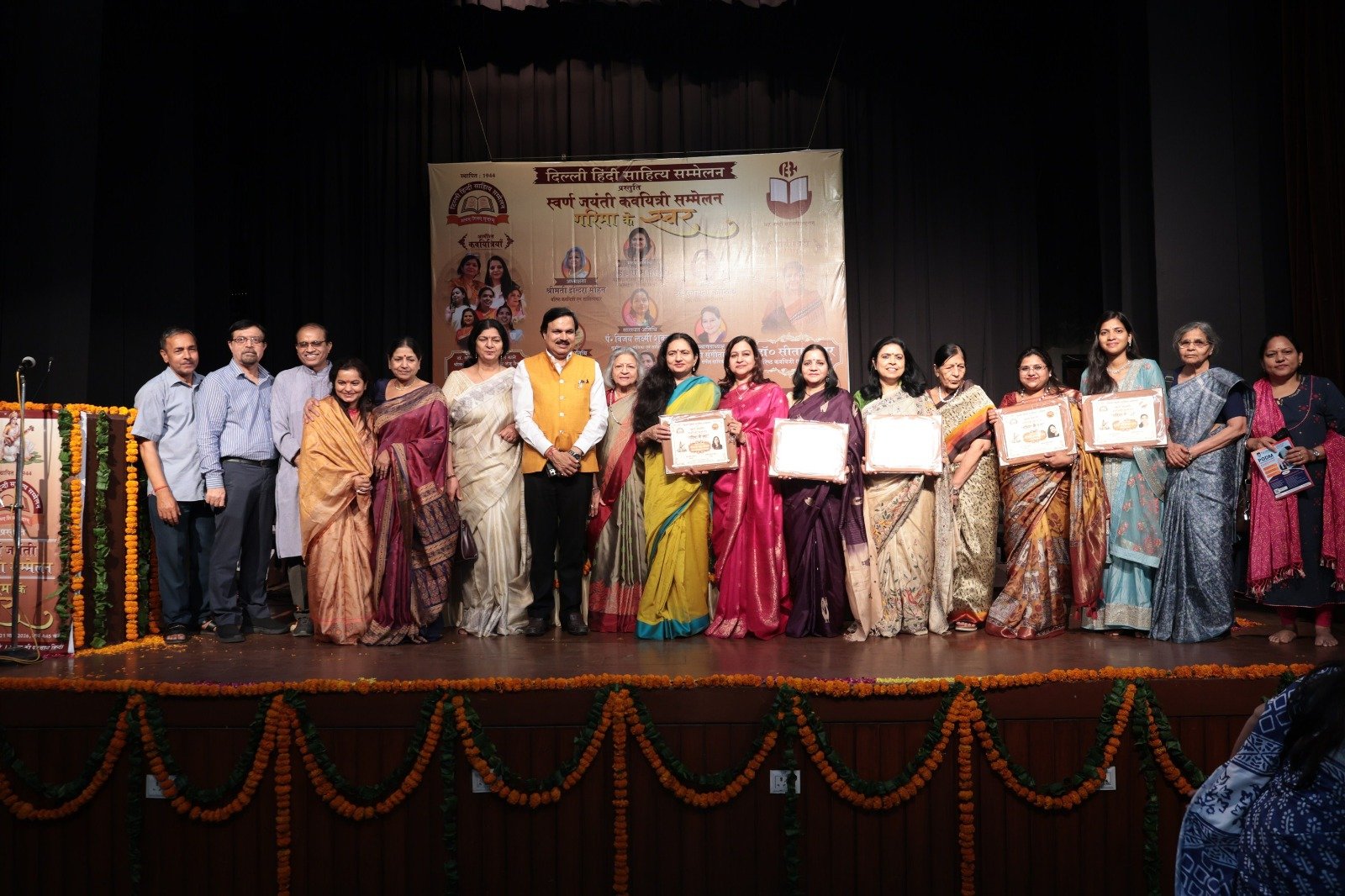नई दिल्ली। दिल्ली हिंदी साहित्य सम्मेलन द्वारा ‘गरिमा के स्वर’ स्वर्ण जयंती कवयित्री सम्मेलन का भव्य आयोजन हिंदी भवन, नई दिल्ली के सभागार में संपन्न हुआ। इस मौके पर कार्यक्रम की अध्यक्षता वरिष्ठ कवयित्री एवं साहित्यकार तथा सम्मेलन की अध्यक्ष श्रीमती इंदिरा मोहन ने की। कार्यक्रम में मुख्य अतिथि के रूप में डॉ. रश्मि सिंह, सचिव, महिला एवं बाल विकास कल्याण विभाग, दिल्ली सरकार की गरिमामयी उपस्थिति रही,इस अवसर पर सान्निध्य डॉ. रत्नावली कौशिक, सह मंत्री, हिंदी भवन का प्राप्त हुआ. स्वागताध्यक्ष के रूप में संगीत साधिका संगीता गुप्ता की उपस्थिति रही, सारस्वत अतिथि के रूप में पंडित विजयलक्ष्मी शुक्ल, सुप्रसिद्ध कथा वाचिका एवं साहित्यकार तथा डॉ वीणा भाटिया, हिंदी सेवी एवं शिक्षाविद् की गरिमामयी उपस्थिति रही।