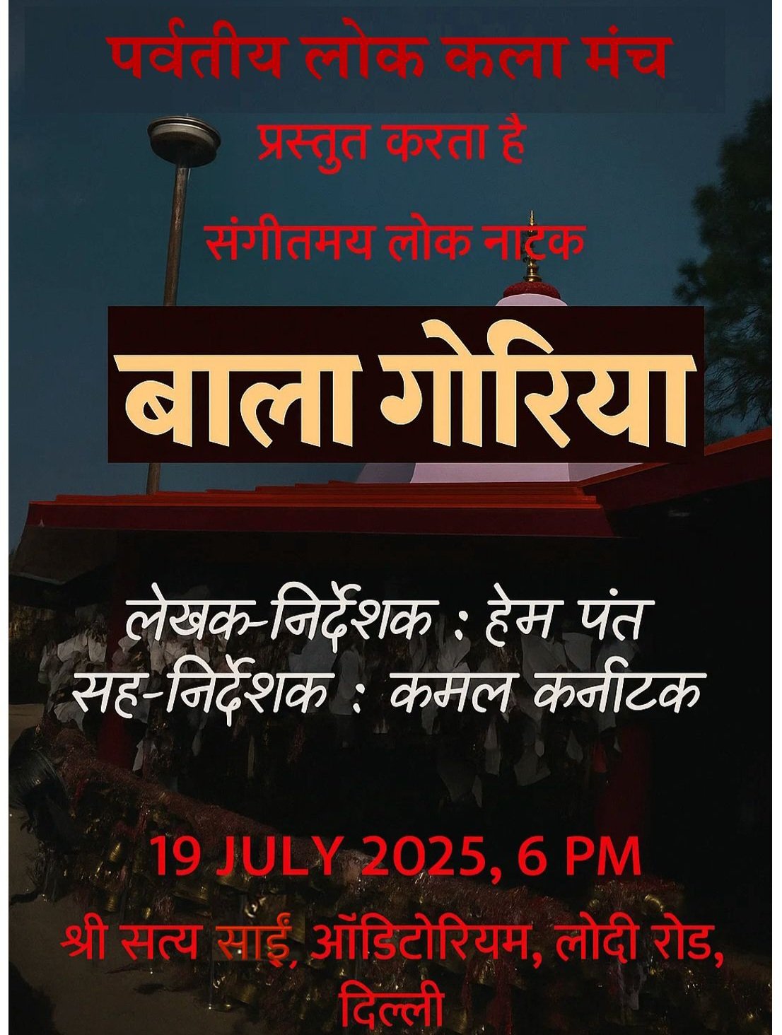 Amar chand दिल्ली, 2 जुलाई।पर्वतीय लोक कला मंच उत्तर भारत की सांस्कृतिक विरासत को जीवंत रखने के अपने प्रयासों के अंतर्गत एक बार फिर एक भव्य आयोजन करने जा रहा है। इस बार मंच प्रस्तुत करेगा ‘बाला गोरिया’, जो एक संगीतमय लोक नाटक है। यह कार्यक्रम 19 जुलाई 2025 को शाम 6 बजे दिल्ली स्थित श्री सत्य साईं ऑडिटोरियम, लोधी रोड में आयोजित किया जाएगा।