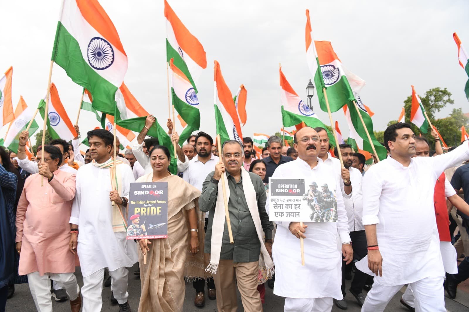 सेना के आप्रेशन सिंदूर की सफलता और उसके बाद पाकिस्तान पर सख्त सैन्य कार्रवाई के समर्थन में सिटिजन फार नैशनल सिक्यूरिटी द्वारा आहूत तिरंगा यात्रा में, हाथों में तिरंगा लहराते हजारों दिल्ली वालों के साथ भाजपा के राष्ट्रीय महामंत्री तरूण चुघ, दिल्ली की मुख्य मंत्री श्रीमती रेखा गुप्ता, दिल्ली भाजपा के अध्यक्ष वीरेन्द्र सचदेवा के आलावा केन्द्रीय राज्य मंत्री हर्ष मल्होत्रा, दिल्ली भाजपा के संगठन महामंत्री पवन राणा, सांसद मनोज तिवारी, रामवीर सिंह बिधूड़ी, श्रीमती कमलजीत सहरावत, योगेन्द्र चंदोलिया, सुश्री बाँसुरी स्वराज, दिल्ली सरकार के मंत्री प्रवेश साहिब सिंह, सरदार मनजिंदर सिंह सिरसा, आशीष सूद, कपिल मिश्रा, रविन्द्र इंद्राज, एन.डी.एम.सी. उपाध्यक्ष श्री कुलजीत सिंह चहल और अनेक विधायक एवं निगम पार्षदों के आलावा महामंत्री श्री विष्णु मित्तल सहित दिल्ली भाजपा के वरिष्ठ पदधिकारी भी सम्मिलित हुए।