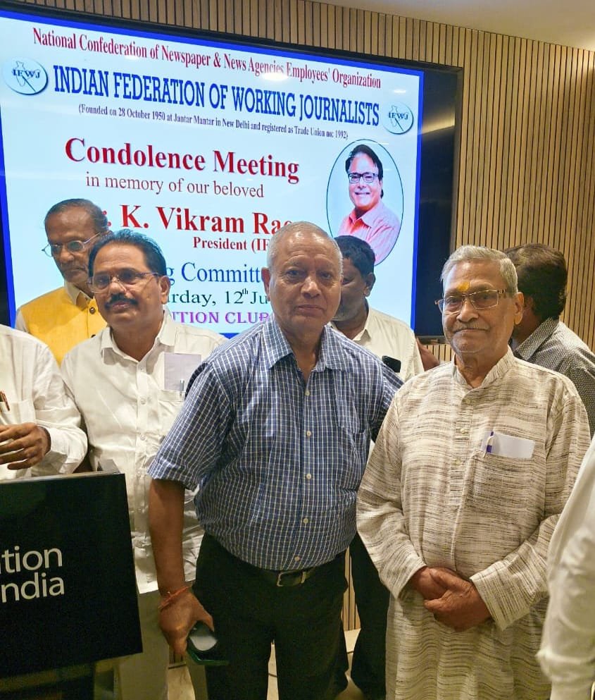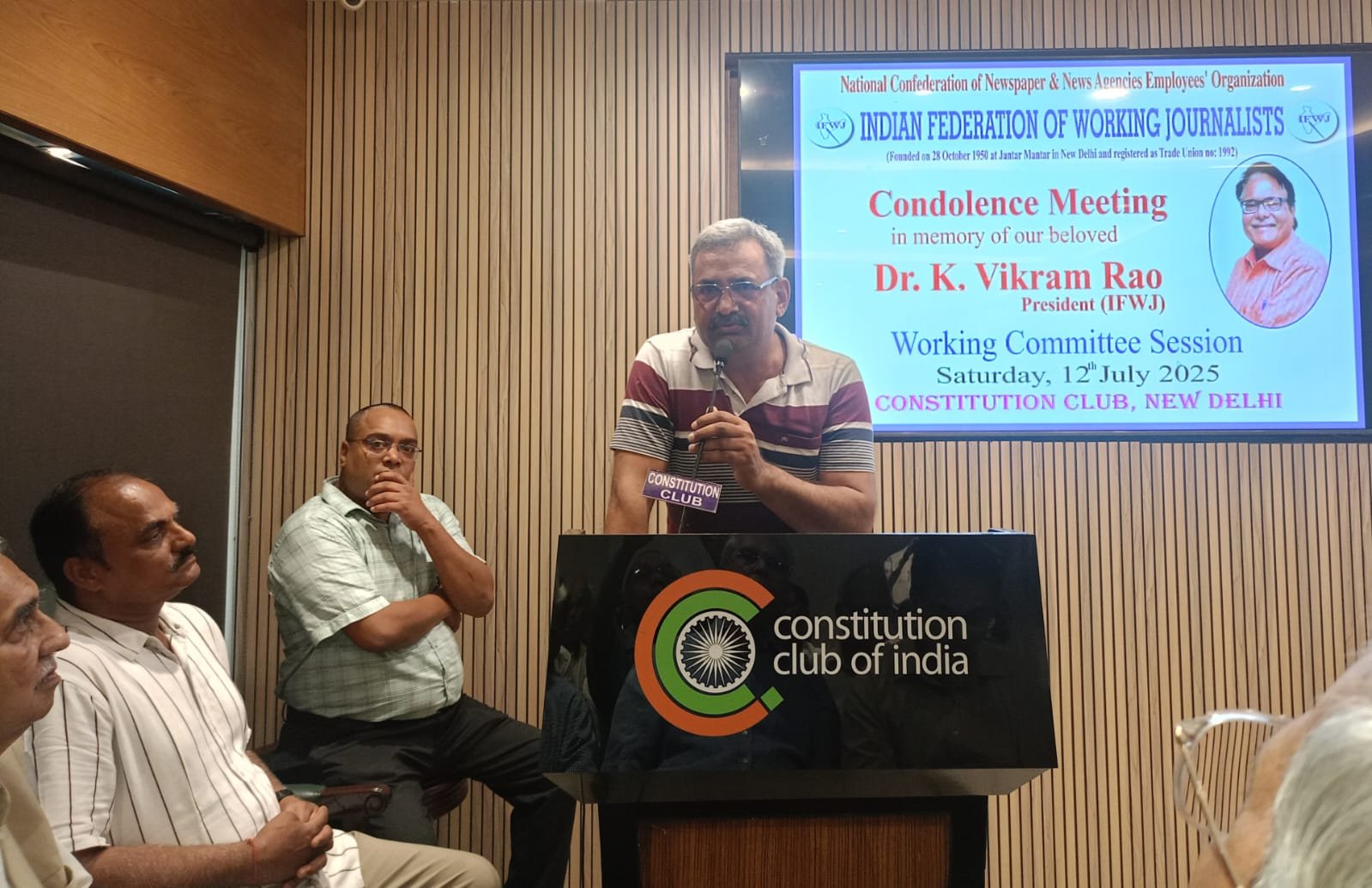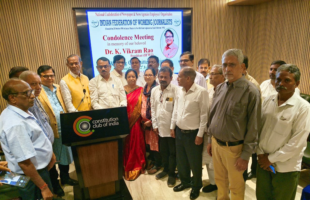 नई दिल्ली। देश की शीर्ष मीडिया कन्फडरेशन ‘नेशनल कन्फडरेशन आफ न्यूज पेपर्स एंड न्यूज एजैंसीज इंप्लाईज आर्गेनाईजेशन’ तथा इंडियन फेडरेशन ऑफ वर्किंग जर्नलिस्ट के संयुक्त तत्वाधान में 12 जुलाई को कंस्टीट्यूशन क्लब सभागार में इंडियन फेडरेशन ऑफ वर्किंग जर्नलिस्ट के दिवंगत अध्यक्ष के विक्रम राव को भावभीनी श्रद्धांजलि अर्पित करने हेतु श्रद्धांजलि सभा का आयोजन किया गया।