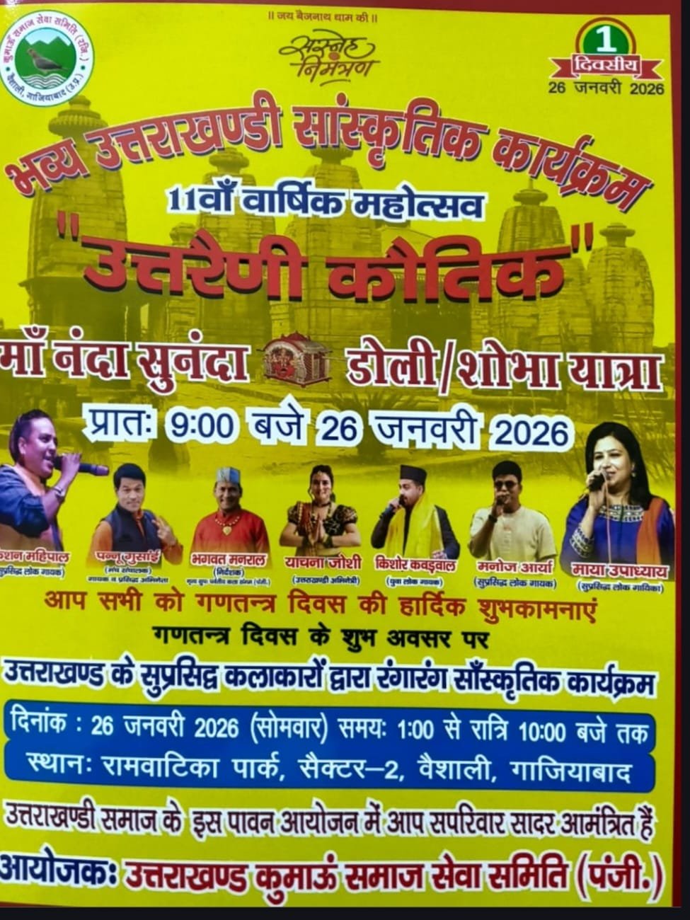 यह जानकारी अमर संदेश को समिति के अध्यक्ष हरीश साह द्वारा दी गई।।यह सांस्कृतिक आयोजन 26 जनवरी 2026 (सोमवार) को रामवाटिका पार्क, सेक्टर–2, वैशाली, गाजियाबाद में आयोजित होगा। कार्यक्रम का शुभारंभ प्रातः 9:00 बजे मां नंदा–सुनंदा डोली एवं शोभा यात्रा से किया जाएगा, जबकि मुख्य सांस्कृतिक कार्यक्रम दोपहर 1:00 बजे से रात्रि 10: बजे तक चलेगा।