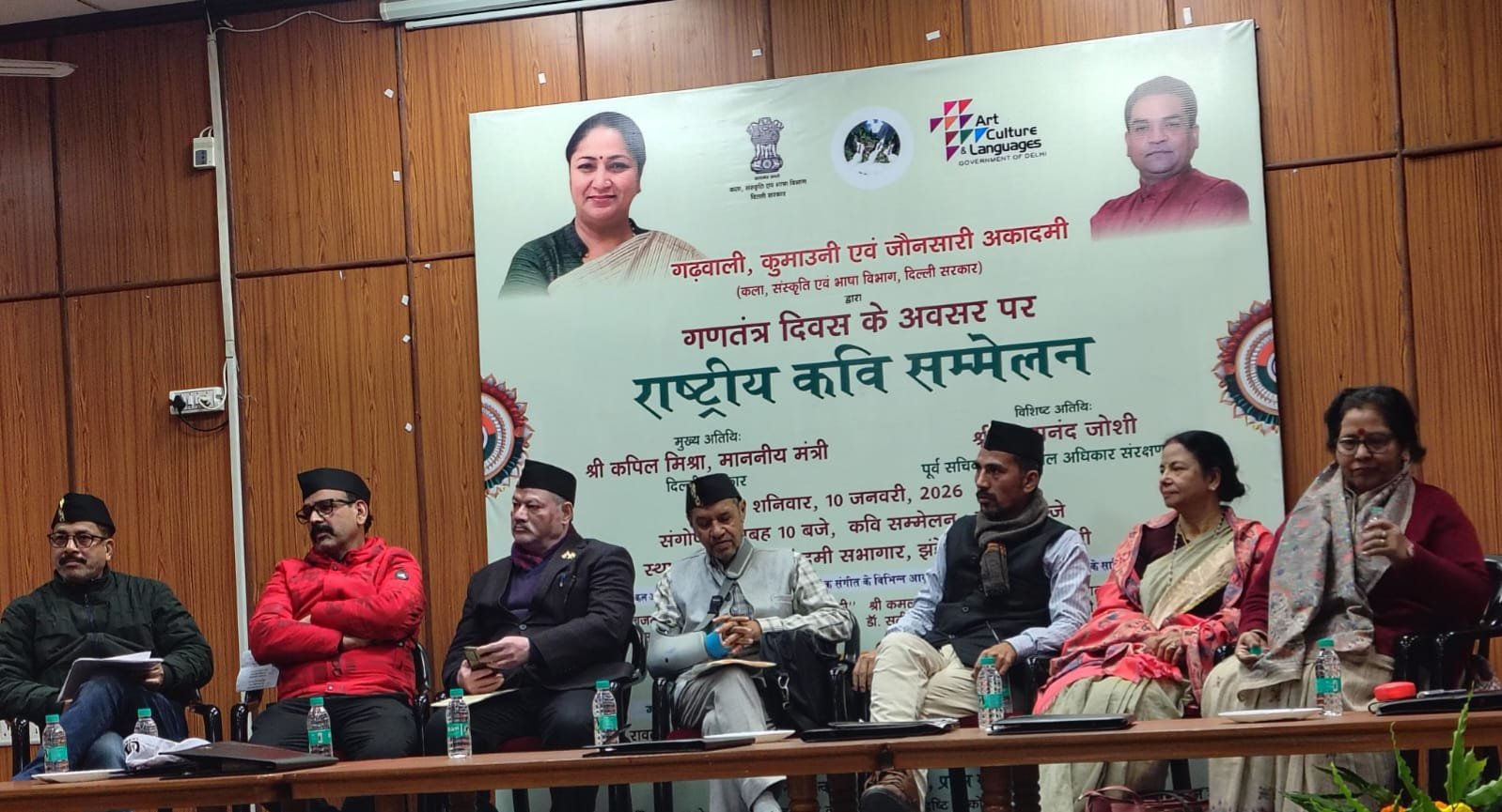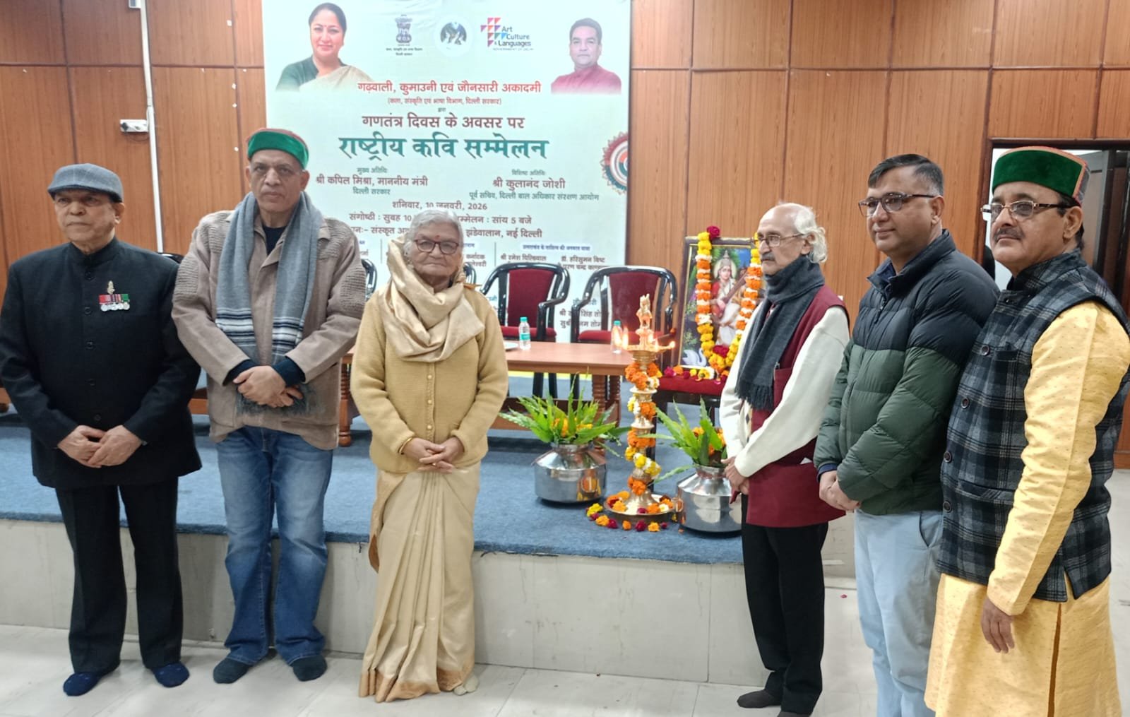 नई दिल्ली। 10 जनवरी को संस्कृत अकादमी सभागार झंडेवालान में दि हाई हिलर्स ग्रुप द्वारा गढ़वाली, कुमाऊनी एवं जौनसारी अकादमी (कला, संस्कृति और भाषा विभाग) दिल्ली सरकार के सौजन्य से गणतंत्र दिवस के अवसर पर राष्ट्रीय कवि सम्मेलन व कला, संस्कृति से जुड़े विभिन्न विषयों पर प्रभावशाली संगोष्ठी का आयोजन किया गया। उक्त आयोजन का श्री गणेश अकादमी सचिव संजय गर्ग, सुप्रसिद्ध साहित्यकार डॉ. हरि सुमन बिष्ट व रमेश घिल्डियाल, जौनसारी कवि खजान दत्त शर्मा, आंचलिक फिल्म निर्देशिका सुशीला रावत तथा कुमाऊनी कवि व साहित्यकार पूरन चंद्र कांडपाल द्वारा दीप प्रज्वलित कर तथा सामूहिक रूप से राष्ट्रगान “जन-गण-मन” गाकर किया गया।