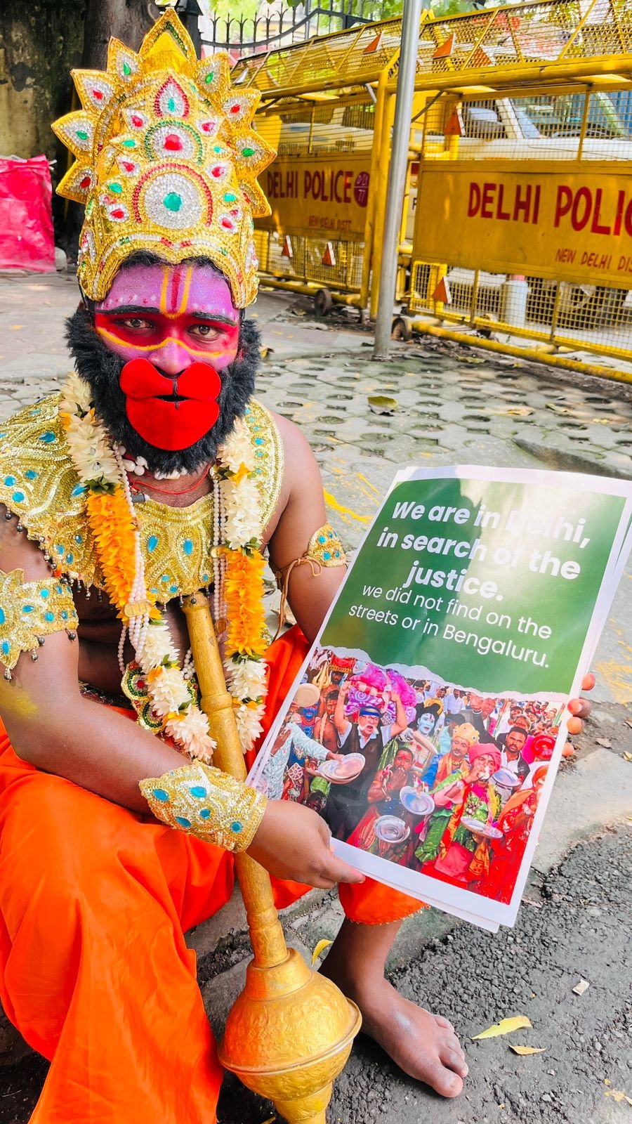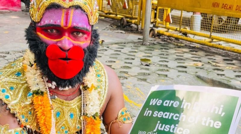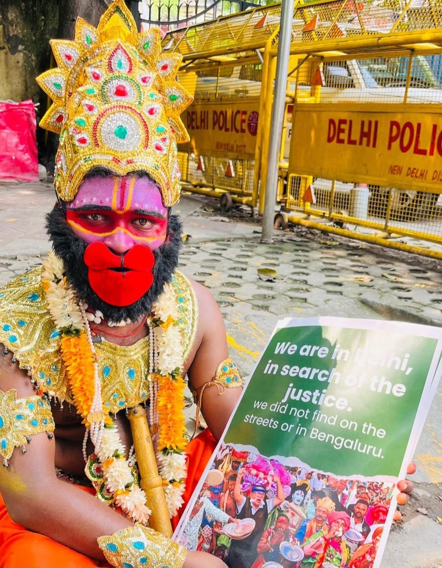 दिल्ली के जंतर-मंतर पर देशभर की आवाज़ें समय-समय पर गूंजती रही हैं। इसी कड़ी में हाल ही में कर्नाटक से आए एक समुदाय के लोग अपनी मांगों को लेकर राजधानी पहुँचे। ध्यान आकर्षित करने का उनका तरीका अनोखा था – उनमें से एक व्यक्ति बजरंगबली के भेष में था, हाथ में गदा और गले में फूल-मालाएँ। पोस्टर पर लिखा था कि वे दिल्ली में न्याय की तलाश में आए हैं, जो उन्हें सड़कों या बेंगलुरु में नहीं मिला।