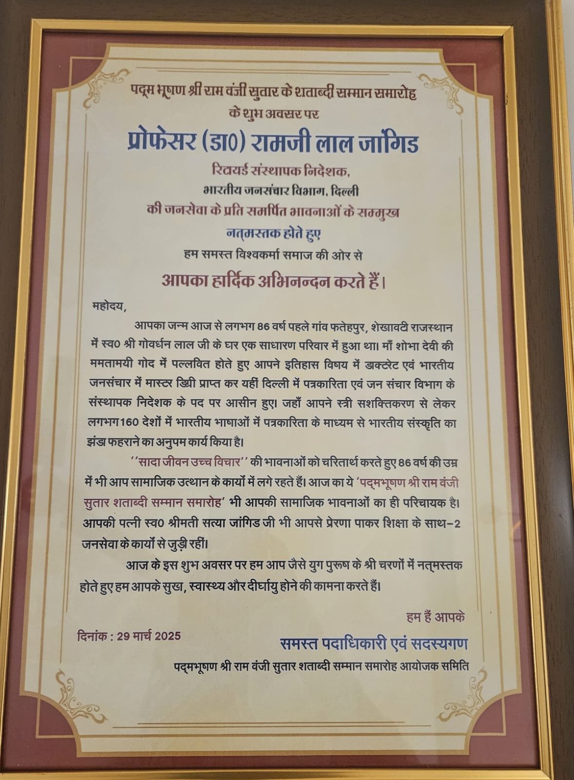 नई दिल्ली। हिंदी पत्रकारिता के साथ-साथ महिलाओं और कमजोर वर्ग के सशक्तिकरण के क्षेत्र में ख्यातिरत शिक्षाविद् प्रोफेसर (डॉ) रामजी लाल जांगिड़ को विगत 29 मार्च को विश्वकर्मा समाज की ओर से ‘पद्मभूषण श्री राम वंजी सुतार शताब्दी सम्मान समारोह’ के अंतर्गत हार्दिक अभिनन्दन कर सम्मानित किया गया तथा 3 अप्रेल को विज्ञान भवन में आयोजित में भारत शिक्षा सम्मान 2025 के अंतर्गत हिंदी पत्रकारिता के संवर्धन व शिक्षा के क्षेत्र में दिए गए प्रेरणादाई योगदान हेतु ‘भारत शिक्षा सम्मान 2025 लाइफ टाइम अचीवमेंट अवार्ड’ से नवाजा गया।