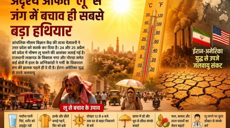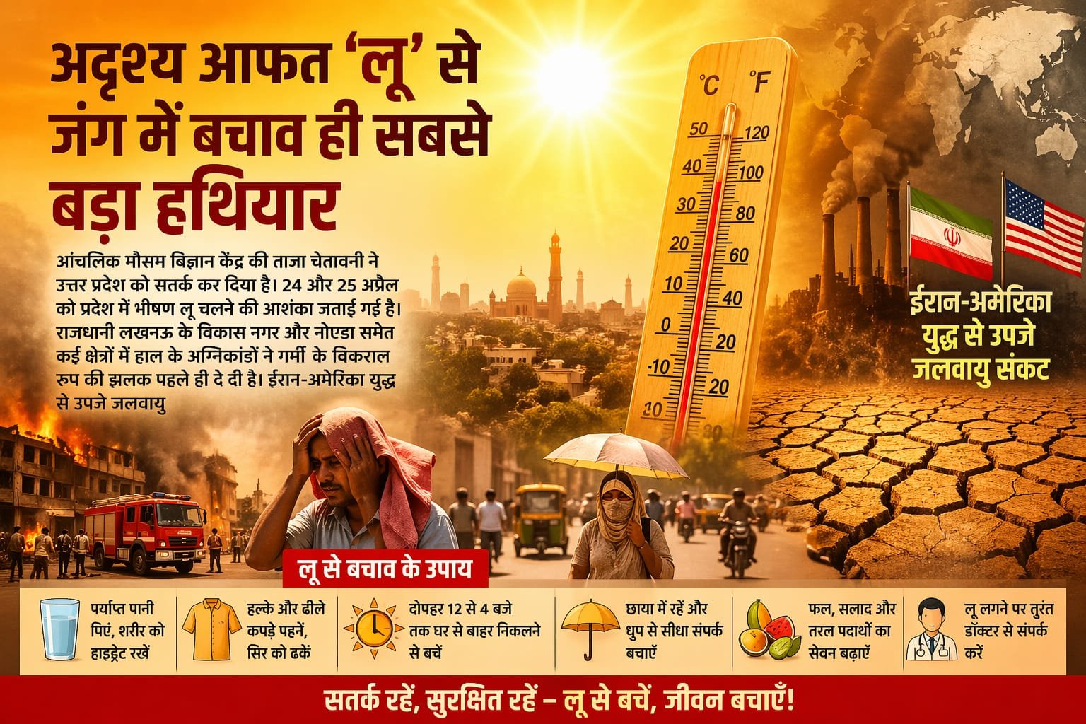 आंचलिक मौसम विज्ञान केंद्र की ताजा चेतावनी ने उत्तर प्रदेश को सतर्क कर दिया है। 24 और 25 अप्रैल को प्रदेश में भीषण लू चलने की आशंका जताई गई है। राजधानी लखनऊ के विकास नगर और नोएडा समेत कई क्षेत्रों में हाल के अग्निकांडों ने गर्मी के विकराल रूप की झलक पहले ही दे दी है। ईरान-अमेरिका युद्ध से उपजे जलवायु परिवर्तन और वैश्विक तापमान वृद्धि ने इस संकट को और गहरा कर दिया है। भारत में लू अब एक गम्भीर मौसमी आपदा के रूप में उभर रही है जिसे विशेषज्ञ ‘साइलेंट किलर’ का नाम दे रहे हैं, क्योंकि यह बिना शोर मचाए शरीर का पानी सोख लेती है और जीवन पर भारी पड़ जाती है।