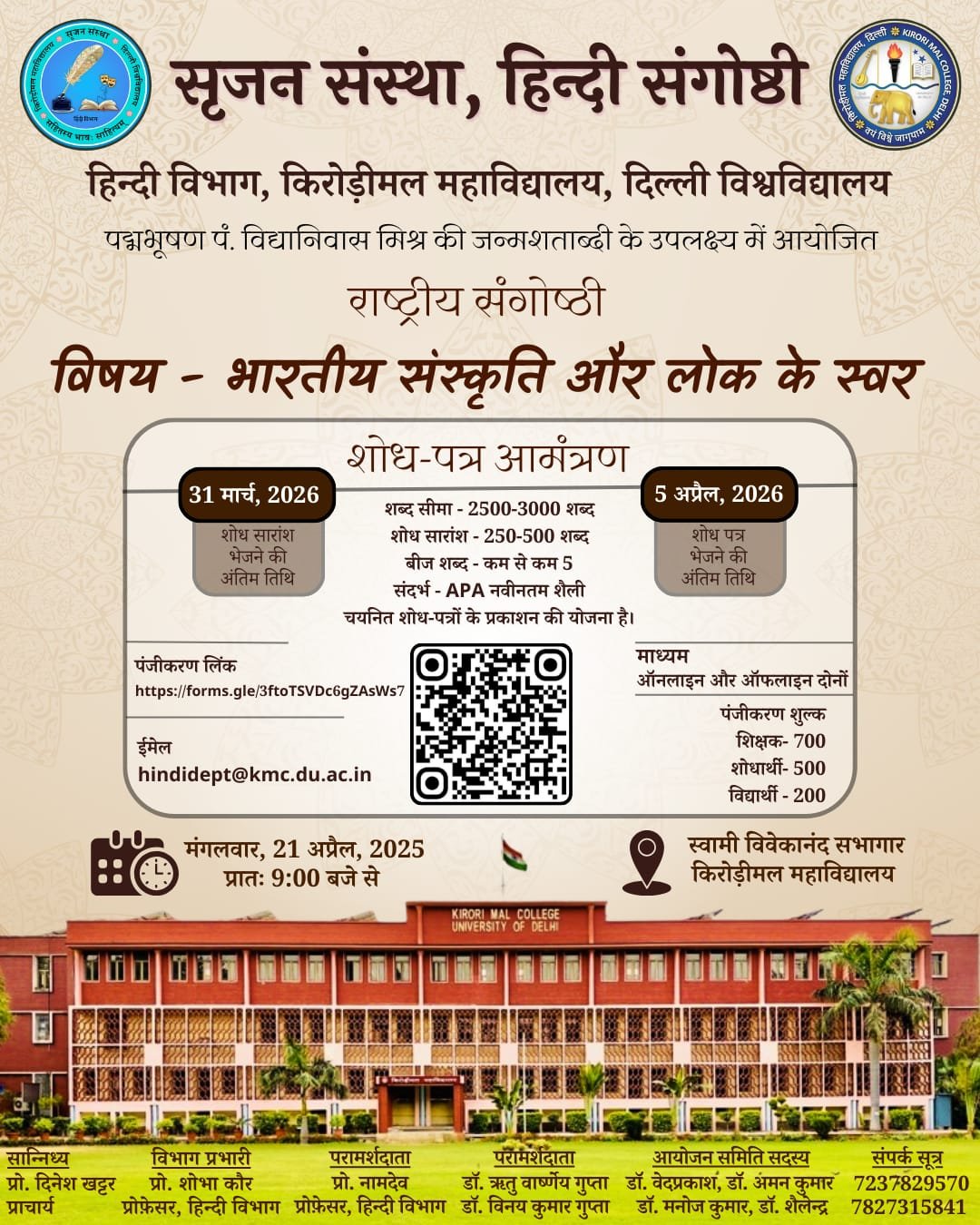 Amar sandesh नई दिल्ली। दिल्ली विश्वविद्यालय के किरोड़ीमल महाविद्यालय के हिंदी विभाग द्वारा ‘सृजन संस्था’ के सहयोग से पद्मभूषण पं. विद्यानिवास मिश्र की जन्मशताब्दी के उपलक्ष्य में ‘भारतीय संस्कृति और लोक के स्वर’ विषय पर एक राष्ट्रीय संगोष्ठी का आयोजन किया जा रहा है। यह संगोष्ठी 21 अप्रैल को प्रातः 9 बजे से महाविद्यालय के स्वामी विवेकानंद सभागार में आयोजित होगी।