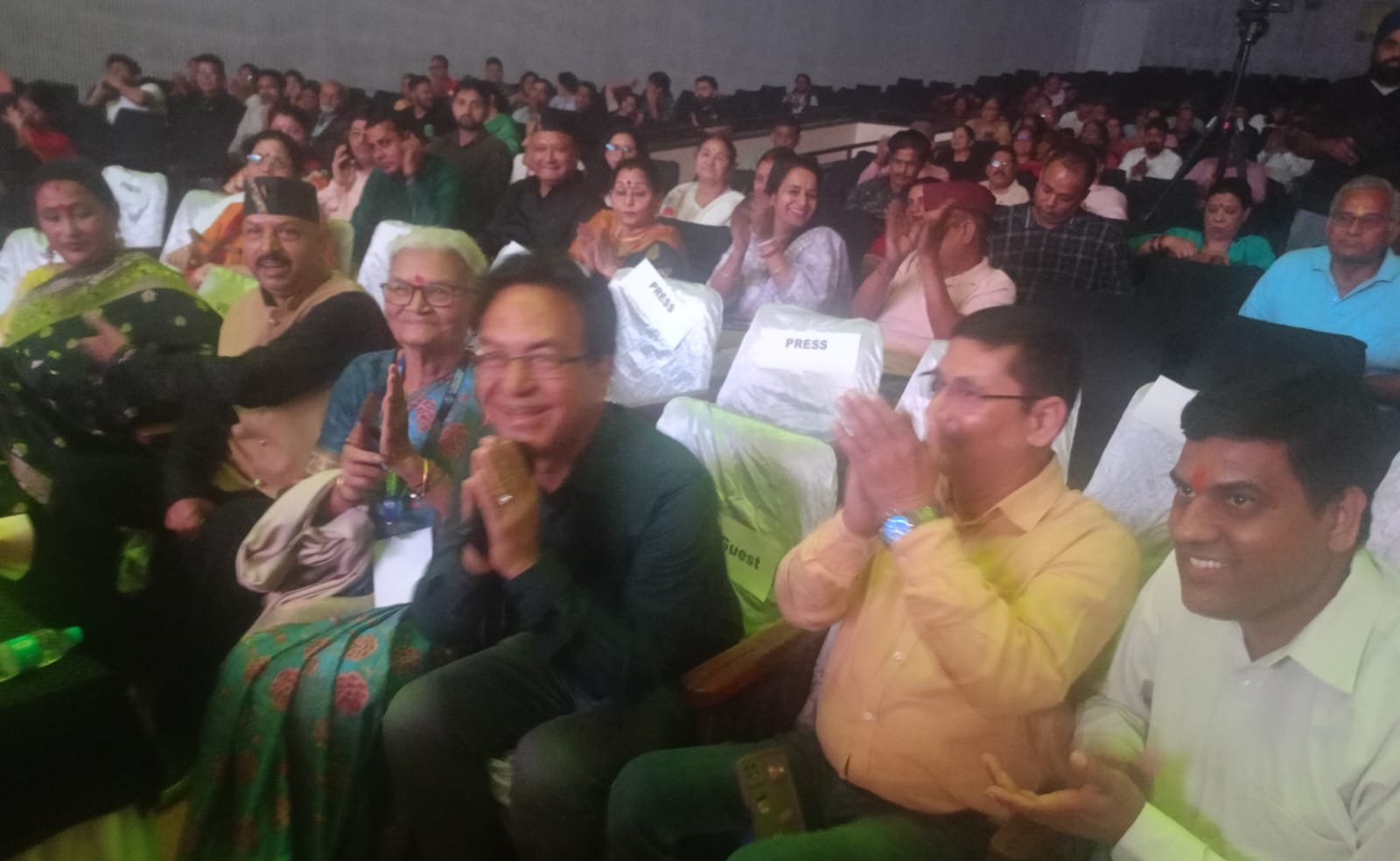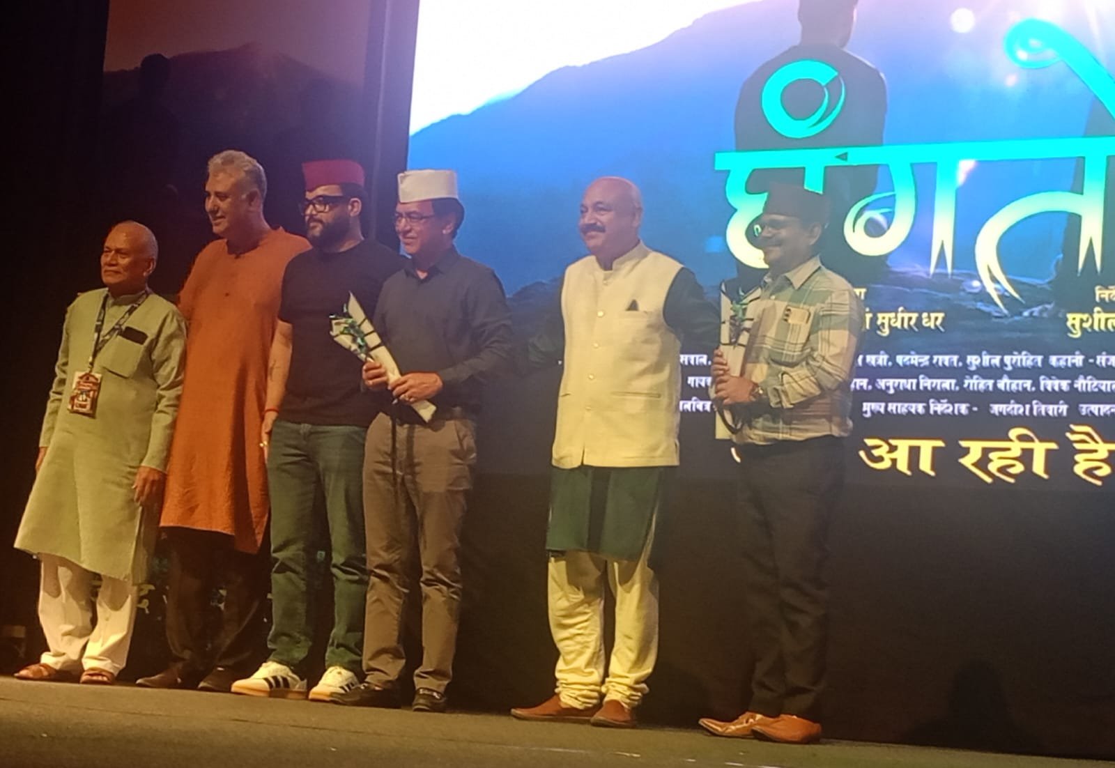 आंचलिक फिल्म ‘घंगतोल’ के टीजर व गीतों को भव्य अंदाज में रिलीज करने के उपरांत जोधा फिल्म निर्माताओं द्वारा मंचासीन सभी मुख्य, विशिष्ट व अन्य अतिथियों तथा फिल्म निर्देशिका सुशीला रावत का तालियों की गड़गड़ाहट के मध्य शाल ओढ़ा कर, आंचलिक टोपी पहनाकर तथा पुष्प गुच्छ भेंट कर सम्मानित किया गया।