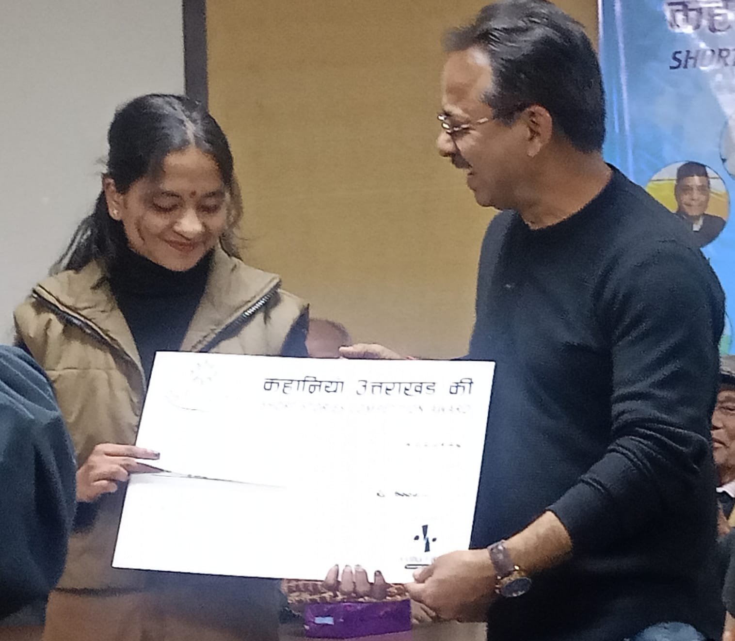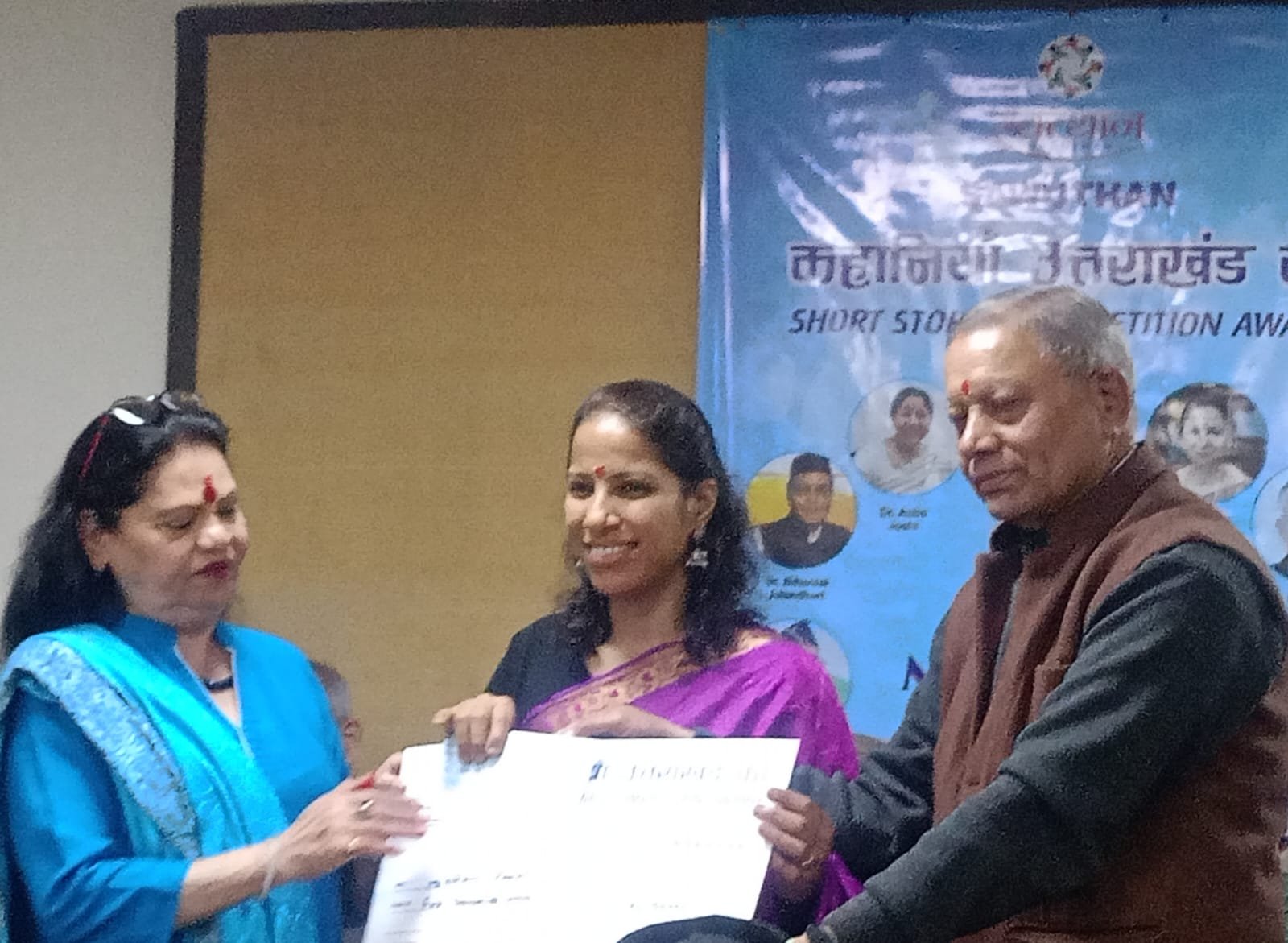‘कहानियां उत्तराखंड की’ सम्मान समारोह के इस अवसर पर आयोजक संस्था पदाधिकारियों व सभागार में उपस्थित आंचलिक फिल्मी व रंगमंच से जुड़े कलाकारों, पत्रकारों, साहित्यकारों, सामाजिक और सांस्कृतिक संस्थाओं से जुड़े प्रबुद्ध जनों में प्रमुख चंदन डांगी, मदन मोहन सती, अजय सिंह बिष्ट, लक्ष्मी रावत, डॉ. पुष्पा जोशी, चंद्र मोहन पपनै, पद्मेद्र रावत, अंजू भंडारी, उमेश चंद्र बंदूनी, राकेश गौड़, सुधीर धर इत्यादि इत्यादि के कर कमलों जूरी द्वारा चयनित रचनाकारों दीपाली खाती (ठंडा चीला), सुशीला देवी (अंधेरी रात में कमला), विशेश्वर प्रसाद (पंची), ललिता (ओगासी माई), किरन रावत (English short story), गार्गी जोशी (ईजा), गिरधारी सिंह (की बोर्ड) तथा के एन पांडे ‘खिमदा’ (बौज्यू और रेडू) को सम्मान स्वरूप अंगवस्त्र ओढ़ा कर, स्मृति चिन्ह व सम्मान पत्र तथा तय राशि के चैक सम्मान स्वरूप प्रदान किए गए।