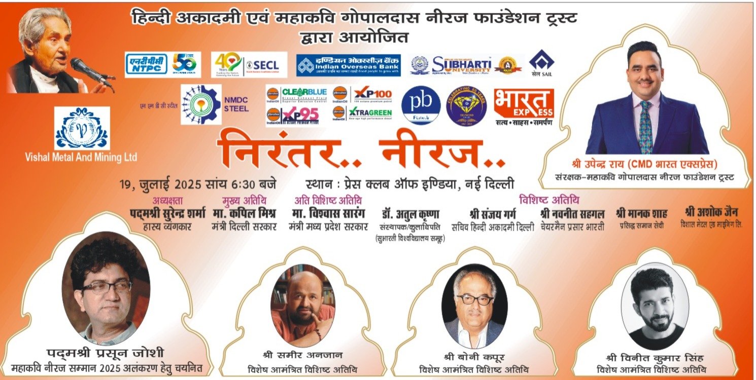 Amar chand नई दिल्ली,। हिंदी अकादमी एवं महाकवि गोपालदास नीरज फाउंडेशन ट्रस्ट द्वारा आगामी 19 जुलाई 2025 को प्रेस क्लब ऑफ इंडिया, नई दिल्ली में एक भव्य साहित्यिक आयोजन “निरंतर… नीरज…” का आयोजन किया जा रहा है। यह आयोजन महाकवि गोपालदास नीरज की अमर काव्य परंपरा को आगे बढ़ाने और उनकी स्मृति को जीवंत बनाए रखने के उद्देश्य से किया जाता है।