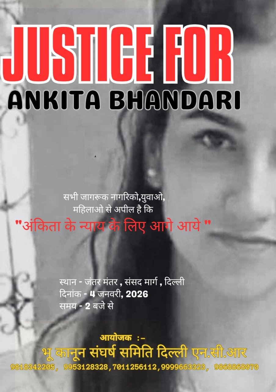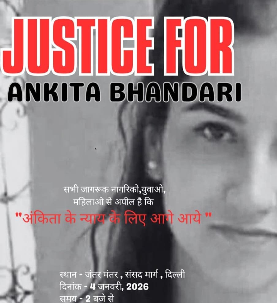 अंकिता भंडारी हत्याकांड की सीबीआई जांच और इस कांड में शामिल सभी दोषियों को सख्त सजा दिलाने के उद्देश्य से राजधानी दिल्ली में भी आंदोलन तेज किया जा रहा है। इसी क्रम में भू-कानून संयुक्त संघर्ष समिति रविवार, 4 जनवरी 2026 को दिल्ली के जंतर-मंतर पर एक विशाल धरना आयोजित करेगी। यह धरना सीबीआई जांच की मांग को मजबूती से उठाने और सरकार द्वारा संरक्षण दिए जा रहे दोषी वीआईपी को कानून के कठघरे में लाने के लिए समिति के नेतृत्व में किया जाएगा।