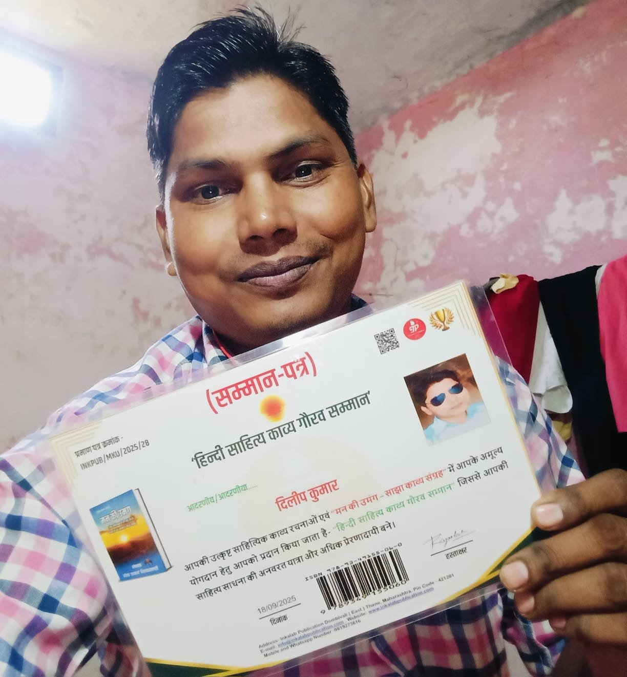 आजमगढ़। हिंदी साहित्य की नई पीढ़ी में उभरते हुए युवा कवि दिलीप कुमार अपनी संवेदनशील लेखनी और गहन चिंतन के लिए तेजी से पहचान बना रहे हैं। कविता, ग़ज़ल, शायरी और शोध आलेखों के माध्यम से उन्होंने समाज और मानवीय भावनाओं को प्रभावशाली अभिव्यक्ति दी है।